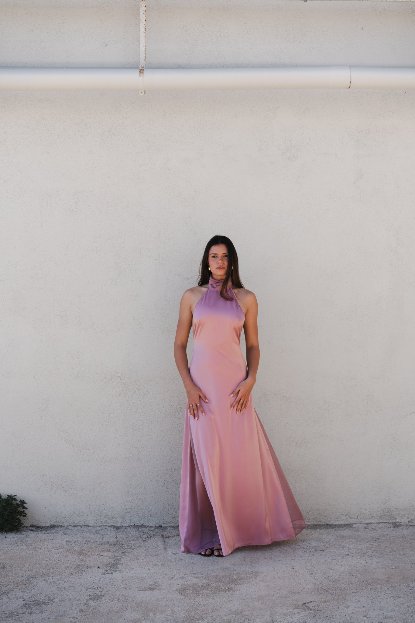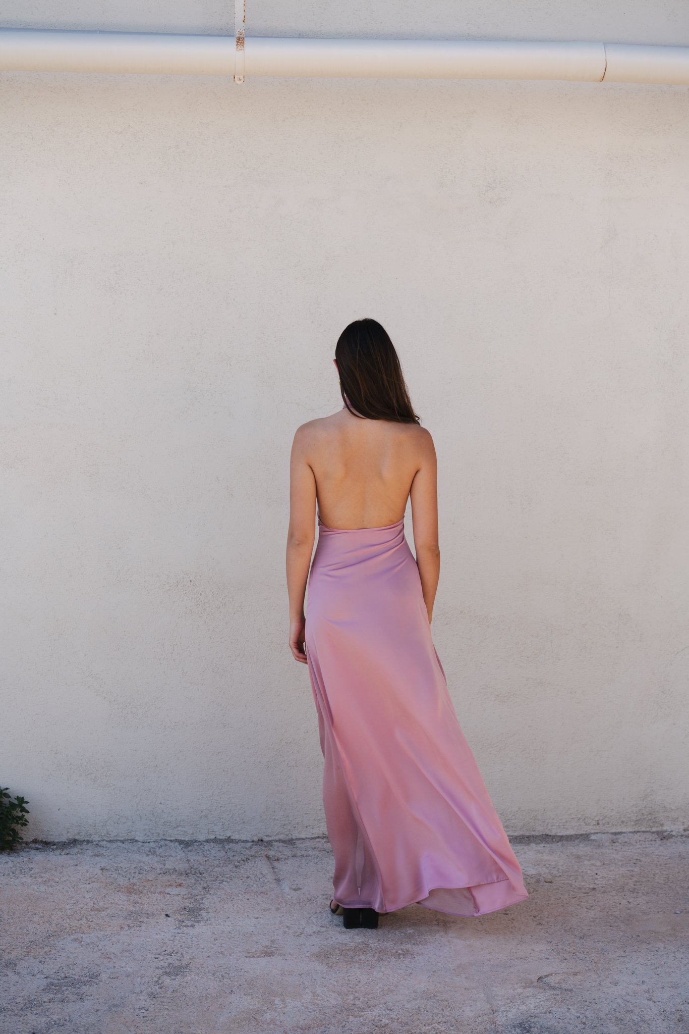Vestido Maria color rosa largo cuello halter, espalda abierta y godets en los